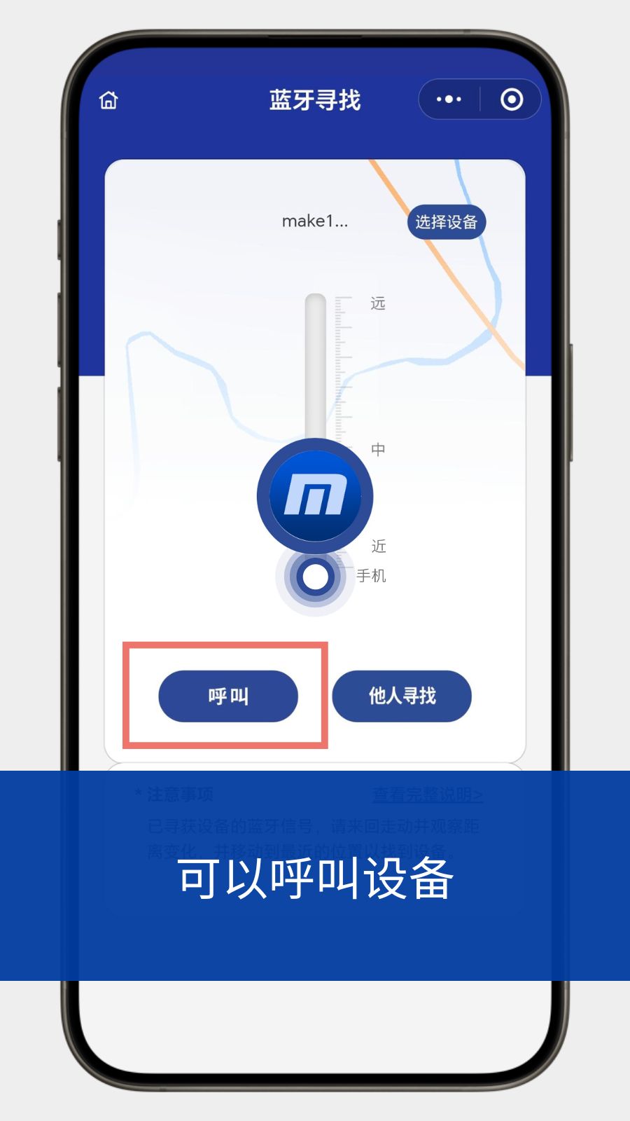 如显示了设备头像,且左侧按钮显示“呼叫”,则您已经位于设备蓝牙信号范围内,头像右侧标注了“近中远”的距离等级。
