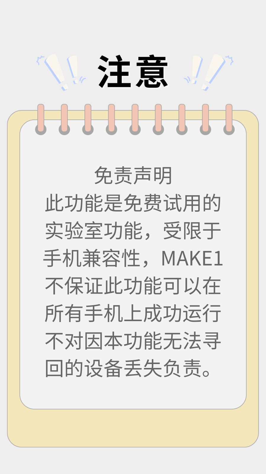 请注意,此功能是免费试用的实验室功能,受限于手机兼容性,MAKE1不保证此功能可以在所有手机上成功运行。不对因本功能无法寻回的设备丢失负责。